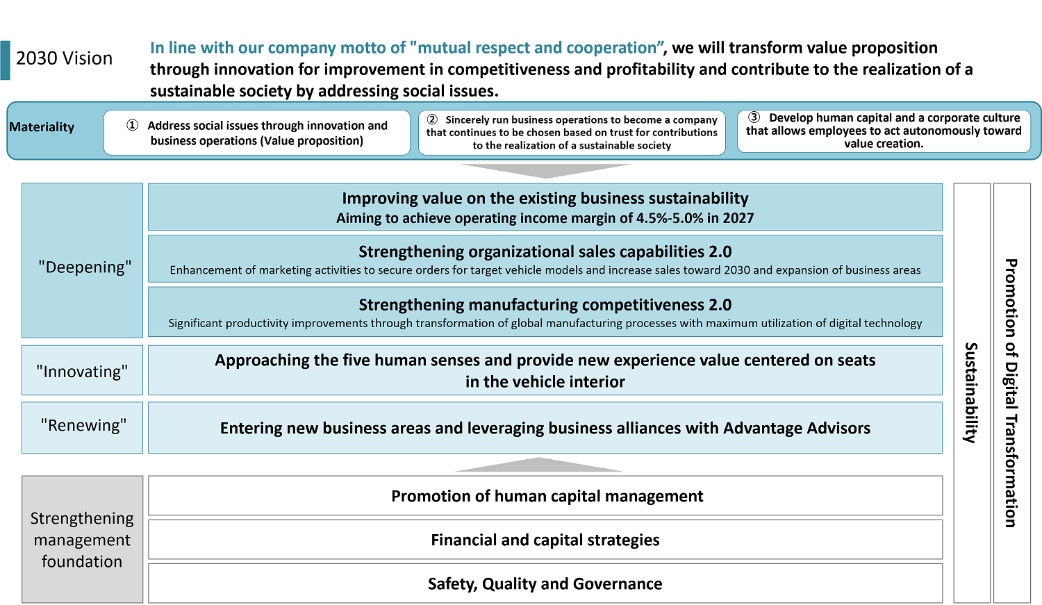 In line with our company motto of "mutual respect and cooperation”, we will transform value proposition through innovation for improvement in competitiveness and profitability and contribute to the realization of a sustainable society by addressing social issues.