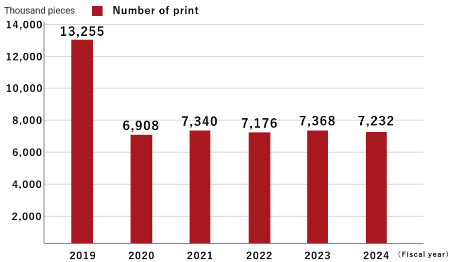We have been working on paperless activities since fiscal 2019. We are working to reduce the number of printed pages by promoting electronic document management in accordance with regulations, electronic expense settlement and invoices, and electronic distribution of documents. We continue to utilize digital technology to improve productivity and establish paperless operations regardless of where we work.