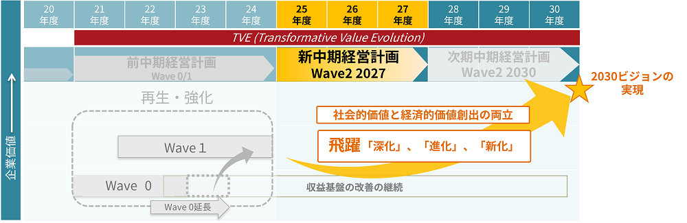 2030ビジョンおよび新中期経営計画TVE Wave2 2027の位置づけ