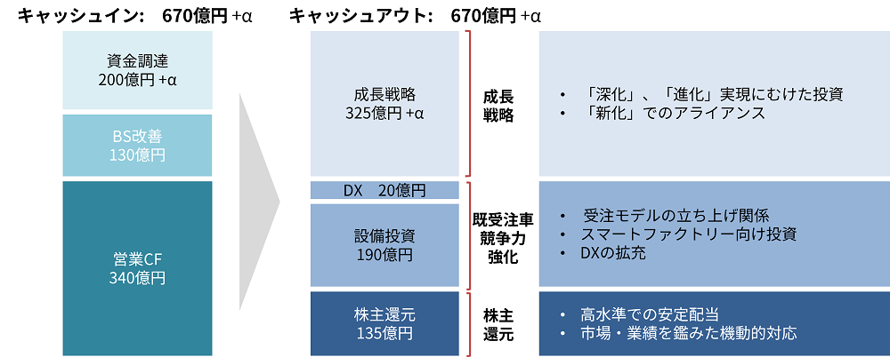 キャッシュアウト: 株主還元で135億円、既受注・競争力強化210億円、成長戦略325億円