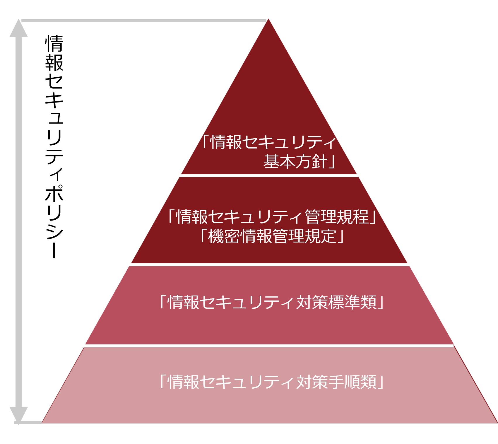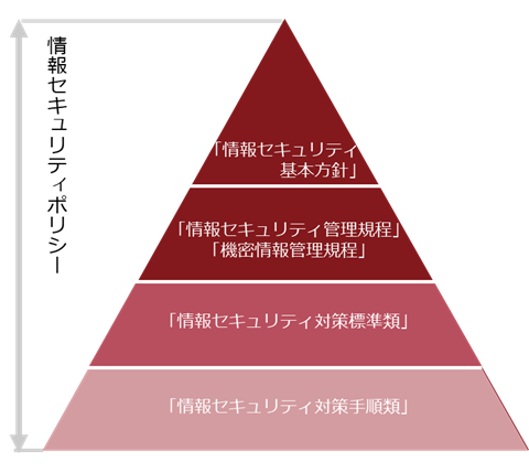 当社は、情報資産を保護するために、情報セキュリティ基本方針を定めています。本方針に基づき、継続的な情報セキュリティ対策に取り組み、情報漏洩などの問題発生を防止し、お客様の信頼を保持していきます。なお、情報セキュリティポリシーとは、組織の情報資産を守るための方針や基準を明文化したもので、以下のように構成しています。